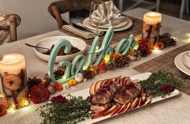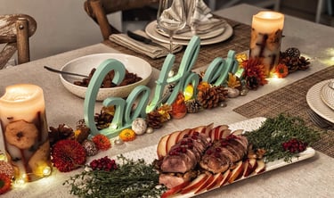 Centerpieces: Use flowers, greenery, candles, decorative elements or seasonal decor that goes with your theme. Make sure to keep room for laying out the food and avoid tall elements to not obstruct conversations.